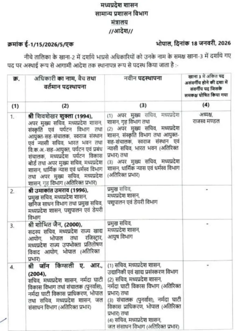 मध्यप्रदेश में एक बार फिर बड़ा प्रशासनिक फेरबदल किया गया है। राज्य सरकार ने 18 जनवरी (रविवार) को 26 आईएएस अधिकारियों के तबादले की सूची जारी की है। इस प्रशासनिक बदलाव में कई अहम विभागों की जिम्मेदारी बदली गई है। मुख्यमंत्री डॉ. मोहन यादव ने इस तबादले में वरिष्ठ सचिवों पर भरोसा जताते हुए उन्हें महत्वपूर्ण विभागों की कमान सौंपी है।