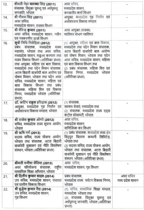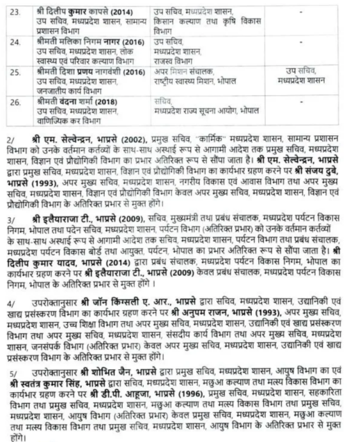 इस ट्रांसफर लिस्ट में यह स्पष्ट नजर आता है कि ACS और प्रमुख सचिव स्तर के अधिकारियों की कमी के चलते मुख्यमंत्री मोहन यादव ने वरिष्ठ सचिवों पर भरोसा जताया है। प्रमुख सचिव से नीचे स्तर के कई सचिवों को पहली बार स्वतंत्र रूप से विभागों का प्रभार सौंपा गया है। इनमें प्रमुख रूप से शोभित जैन, स्वतंत्र कुमार सिंह, इलैयाराजा टी, जॉन किंग्सले, आलोक सिंह और श्रीमन शुक्ला जैसे अधिकारी शामिल हैं।