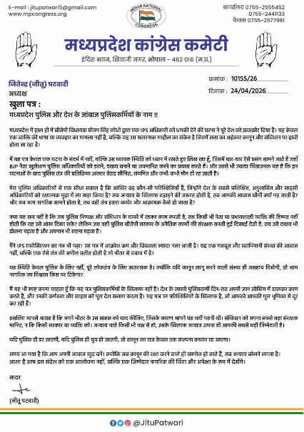 जीतू पटवारी ने कहा कि यह पत्र केवल एक घटना के संदर्भ में नहीं बल्कि उस व्यापक स्थिति को ध्यान में रखते हुए लिखा जा रहा है, जिसमें बार-बार ऐसे प्रसंग सामने आते हैं जहां BJP नेता खुलेआम पुलिस अधिकारियों को डराने, दबाव बनाने या अपमानित करने का प्रयास करते हैं और उससे भी ज्यादा चिंताजनक यह है कि घटनाओं के बाद पुलिस तंत्र की प्रतिक्रिया अक्सर बेहद सीमित संयमित और कभी-कभी मौन ही रह जाती है। उन्होंने पुलिस अधिकारियों से सीधा सवाल किया कि आखिर वह कौन-सी परिस्थितियां हैं, जिन्होंने देश के सबसे प्रशिक्षित, अनुशासित और साहसी अधिकारियों को रक्षात्मक मुद्रा में ला खड़ा किया है? जब अन्याय के खिलाफ दहाड़ने की जरूरत होती है, तब आपकी आवाज धीमी क्यों पड़ जाती है? और जब आम नागरिक सामने होता है तब वही तंत्र इतना कठोर और आक्रामक कैसे हो जाता है?