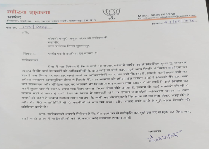 बुरहानपुरः भाजपा पार्षद गौरव शुक्ला ने अपने पद से इस्तीफा दिया है। गौरव शुक्ला क्षेत्र में विकास कार्यों का नहीं होने से नाराज चल रहे थे। उन्होंने अपनी नाराजगी जाहिर करते हुए महापौर माधुरी पटेल को अपना इस्तीफा सौंपा।