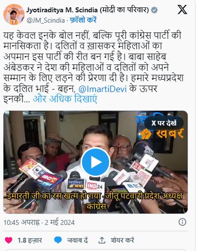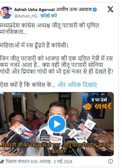 बीजेपी नेता आशीष अग्रवाल ने सोशल मीडिया एक्स पर लिखा है कि मध्यप्रदेश कांग्रेस अध्यक्ष जीतू पटवारी की घृणित मानसिकता। महिलाओं में रस ढूंढते हैं कांग्रेसी। जिन जीतू पटवारी को भाजपा की एक दलित नेत्री में रस कम नजर आता है। क्या वहीं जीतू पटवारी सोनिया गांधी और प्रियंका गांधी को भी इस नजर से ही देखते हैं।