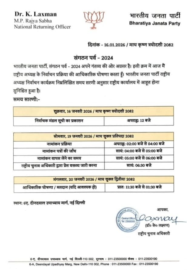 भाजपा के राष्ट्रीय रिटर्निंग ऑफिसर लक्ष्मण ने राष्ट्रीय अध्यक्ष चुनाव की पूरी प्रक्रिया का शेड्यूल जारी किया है। इसके अनुसार, 19 जनवरी को दोपहर 2 बजे से 4 बजे तक नामांकन दाखिल किए जाएंगे। उसी दिन शाम 5 बजे से 6 बजे तक नामांकन वापस लिए जा सकेंगे। यदि एक से अधिक उम्मीदवार सामने आते हैं, तो 20 जनवरी को मतदान कराया जाएगा। इसके बाद उसी दिन नए राष्ट्रीय अध्यक्ष की आधिकारिक घोषणा कर दी जाएगी। पूरी चुनाव प्रक्रिया पार्टी मुख्यालय, नई दिल्ली में संपन्न होगी।