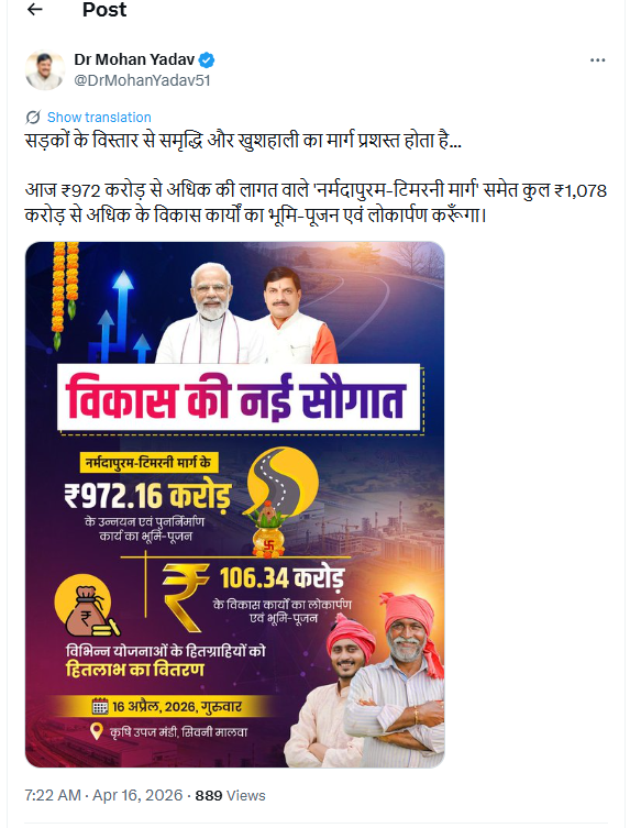 मुख्यमंत्री डॉ. यादव ने सोशल हैंडल X पर पोस्ट करते हुए लिखा- सड़कों के विस्तार से समृद्धि और खुशहाली का मार्ग प्रशस्त होता है। आज ₹972 करोड़ से अधिक की लागत वाले ‘नर्मदापुरम-टिमरनी मार्ग’ समेत कुल ₹1,078 करोड़ से अधिक के विकास कार्यों का भूमि-पूजन एवं लोकार्पण करूँगा।
