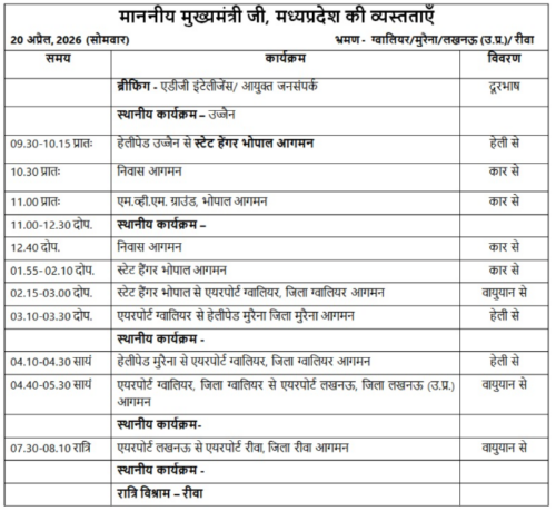 भोपालः मुख्यमंत्री डॉ. मोहन यादव आज कई जिलों के दौरे पर रहेंगे। मुख्यमंत्री डॉ. मोहन यादव के आज के मिनट टू मिनट कार्यक्रम।