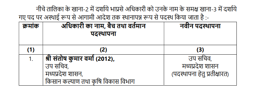अपलोड किए गए सरकारी आदेश के अनुसार संतोष वर्मा को उप सचिव कृषि विभाग से हटाकर सामान्य प्रशासन विभाग में बिना विभाग व बिना कार्य के अटैच कर दिया गया है।