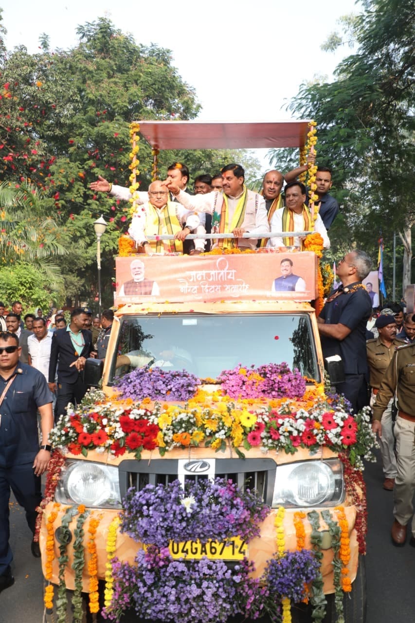 मुख्यमंत्री डॉ. मोहन यादव ने शनिवार को जबलपुर में आयोजित राष्ट्रीय जनजाति गौरव दिवस समारोह में शामिल होने से पहले भव्य रोड शो किया। मुख्यमंत्री ने मार्ग में खड़े लोगों का हाथ हिलाकर अभिवादन किया और जनता से मिले उत्साहपूर्ण स्वागत का आभार जताया।