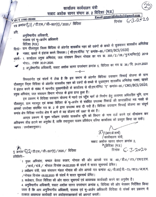 आनंद जाट ने खुलासा किया कि विदिशा उद्वहन सिंचाई परियोजना, जो 1999 में बंद हो गई थी, उसकी बेशकीमती जमीन पर भू-माफियाओं ने कब्जा कर लिया है। जल संसाधन विभाग ने इस जमीन को किसानों को मुआवजा देकर विधिवत अधिग्रहित किया था। आज उन सरकारी नहरों को समतल करके वहाँ भाजपा नेताओं ने घर और भाजपा से जुड़े व्यापारियों ने आलीशान मकान, व्यावसायिक कॉलोनियाँ और पेट्रोल पंप तक बना लिए हैं। सरकारी संपत्ति की इस खुली लूट पर जिला कलेक्टर केवल ‘लेटर-लेटर’ का खेल खेल रहे हैं, धरातल पर कोई ठोस कार्रवाई शून्य है। 2020 में कांग्रेस सरकार ने विदिशा में नहर की ज़मीन भू माफियाओं से मुक्त कराने की कार्यवाही शुरू की थी लेकिन मार्च में सरकार चले जाने के बाद माफियाओं के अच्छे दिन आ गए क्योंकि उनके अपने शिवराज सिंह चौहान दोबारा मुख्यमंत्री बन गए।