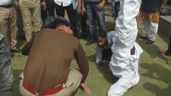 भोपालः सरकार द्वारा कथित झूठी एफआईआर के विरोध में कांग्रेस विधायक बाबूलाल जांडेल ने अनूठा प्रदर्शन किया। बाबूलाल विधानसभा परिसर में गांधी प्रतिमा के सामने शीर्षासन की मुद्रा में कर विरोध प्रदर्शन कर रहे थे। विधायक का कहना है कि उन्होंने पटाखा फोड़ने वाली बंदूक से फायर किया था किसी कानून का उल्लंघन नहीं किया। जबकि भाजपा के नेताओं ने भी कई बार हर्ष फायर किए थे लेकिन उनके ऊपर उन लोगों ने झूठी एफआईआर दर्ज कराई। यही बात वे सरकार को बताने का प्रयास कर रहे हैं। विपक्ष का विधायक होने के नाते उन के ऊपर झूठी एफआईआर दर्ज कराई गई है।
