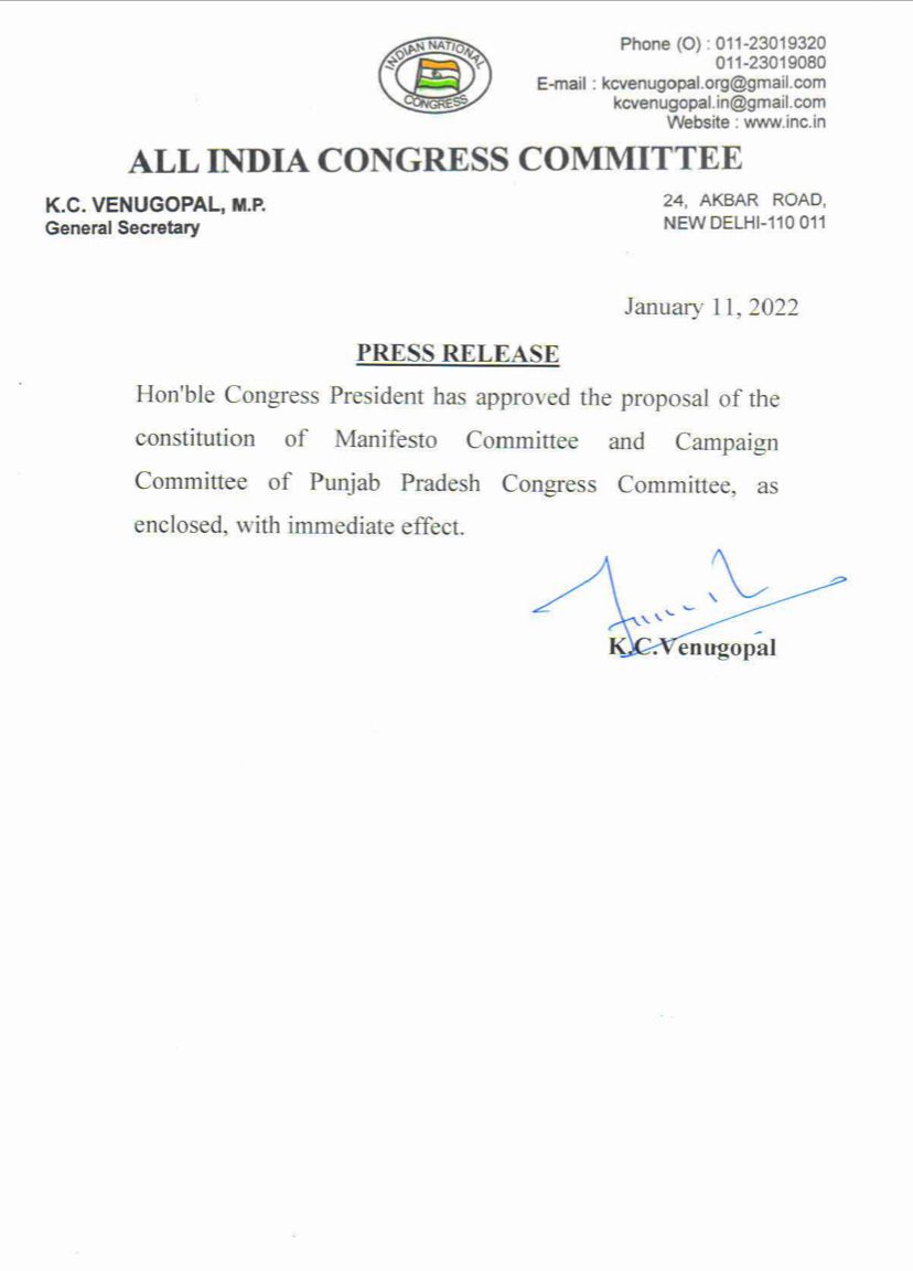 नई दिल्ली: 14 फरवरी को होने वाले विधानसभा चुनाव से पहले पंजाब कांग्रेस की मेनिफेस्टो कमेटी और कैंपेन कमेटी का गठन कर दिया है। आपको बता दे कि एक महिने पहले कांग्रेस हाईकमान ने चुनाव के लिए विभिन्न कमेटियों के गठन का एलान किया था।