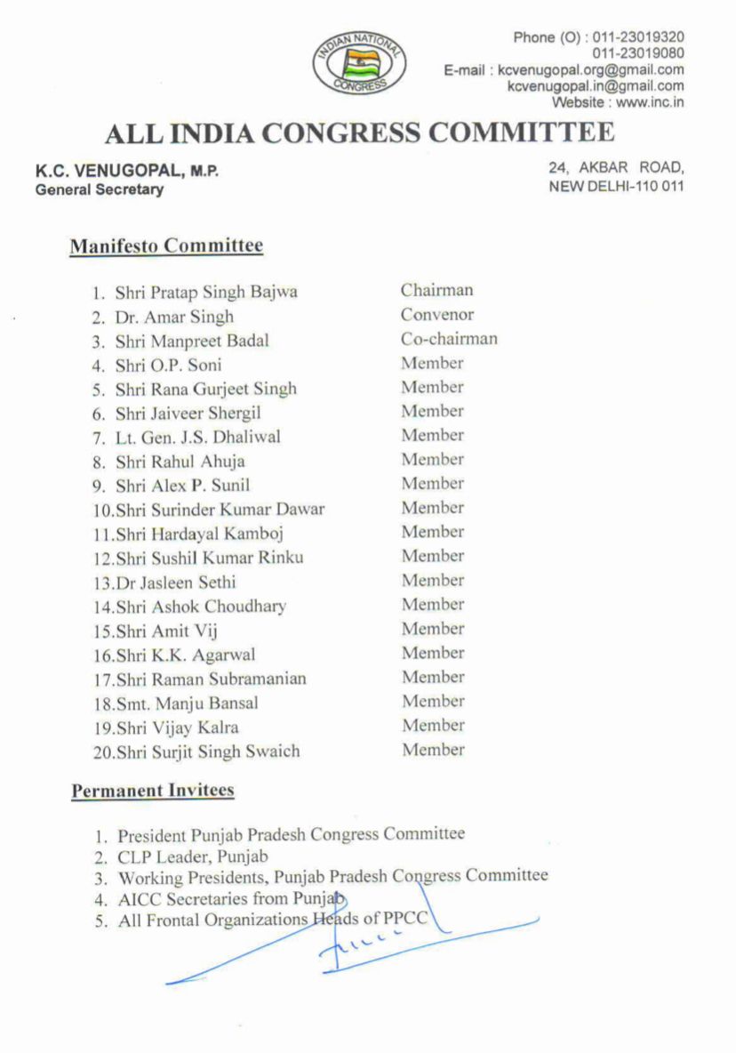 चुनाव घोषणापत्र कमेटी की कमान सांसद प्रताप सिंह बाजवा को सौंपी गई थी। अब डॉ. अमर सिंह को इस कमेटी का संयोजक बनाया गया है। वहीं वित्तमंत्री मनप्रीत बादल को सह प्रभारी बनाया गया था।