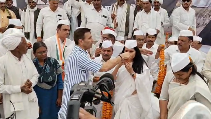 किसान समस्याओं को लेकर भोपाल में 24 घंटे उपवास पर बैठे कांग्रेस सेवादल के कार्यकर्ताओं के विरोध प्रदर्शन में आज पीसीसी चीफ जीतू पटवारी शामिल हुए हैं। इस दौरान उन्होंने उपवास पर बैठे कार्यकर्ताओं का जूस पिलाकर उपवास तुड़वाया। इस दौरान धरने का समापन करते हुए जीतू पटवारी ने कहा कि, सरकार ने 2700 प्रति क्विंटल खरीदी का वादा किया था, मगर आज किसान का एमएसपी पर गेहूं खरीदा नहीं जा रहा है। लिहाजा बाजार में 1800 रु तक गेहूं बेचने को मजबूर है। इसके अलावा कई किसानों को डिफॉल्टर घोषित कर दिया गया है।