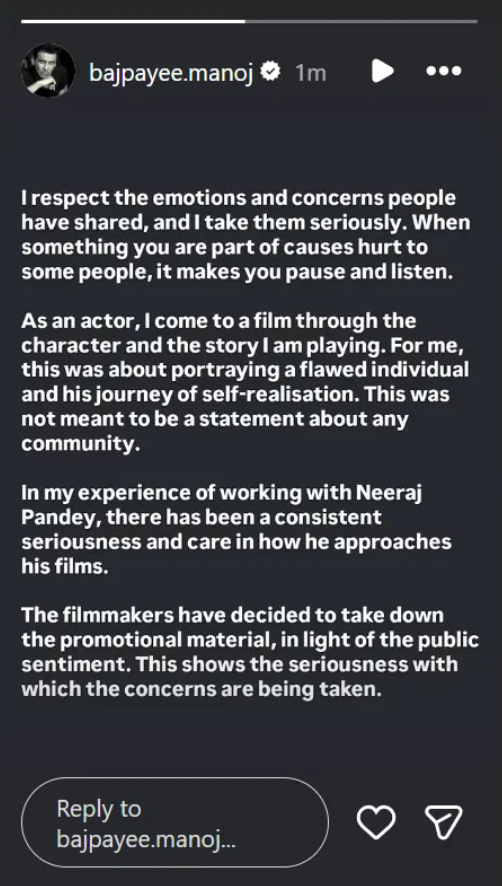 विवाद पर प्रतिक्रिया देते हुए मनोज बाजपेयी ने सोशल मीडिया के जरिए एक बयान जारी किया। उन्होंने कहा कि वे लोगों की भावनाओं और चिंताओं का पूरा सम्मान करते हैं। मनोज बाजपेयी के अनुसार, जब किसी रचना से कुछ लोगों को ठेस पहुंचती है, तो यह जरूरी हो जाता है कि उनकी बात सुनी जाए। उन्होंने स्पष्ट किया कि एक अभिनेता के रूप में वे कहानी और अपने किरदार के नजरिए से फिल्म का हिस्सा बनते हैं।