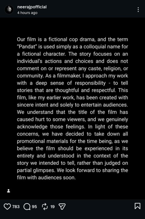 नीरज पांडे ने साफ किया कि फिल्म की कहानी किसी जाति, धर्म या समुदाय का प्रतिनिधित्व नहीं करती, बल्कि एक व्यक्ति के कर्मों और उसके फैसलों पर केंद्रित है। उन्होंने कहा कि उनका उद्देश्य हमेशा ऐसी कहानियां कहना रहा है, जो जिम्मेदारी और सम्मान के साथ बनाई जाएं।
