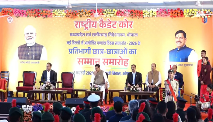 भोपाल स्थित मुख्यमंत्री निवास में ‘गणतंत्र दिवस समारोह 2026’ के प्रतिभागी छात्र-छात्राओं और NCC कैडेट्स के सम्मान में एक विशेष समारोह का आयोजन किया गया। कार्यक्रम के मुख्य अतिथि मध्य प्रदेश के मुख्यमंत्री डॉ. मोहन यादव रहे। इस अवसर पर मुख्यमंत्री ने सभी प्रतिभागी विद्यार्थियों का अभिनंदन करते हुए उन्हें प्रदेश और देश का गौरव बताया।