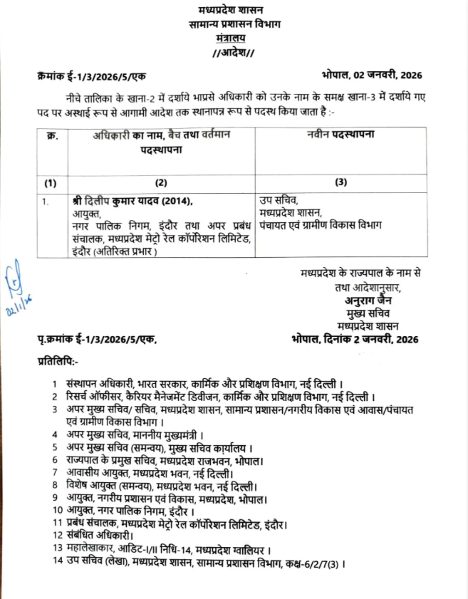 दूषित पेयजल से हुई मौतों के बाद इंदौर नगर निगम में बड़ा प्रशासनिक बदलाव किया गया है। क्षितिज सिंघल ने इंदौर नगर निगम के नए आयुक्त के रूप में पदभार संभाल लिया है। इससे पहले मुख्यमंत्री डॉ. मोहन यादव ने कड़ा एक्शन लेते हुए तत्कालीन आयुक्त दिलीप यादव को पद से हटाकर पंचायत एवं ग्रामीण विकास विभाग में उप सचिव के पद पर पदस्थ करने के निर्देश दिए थे।
