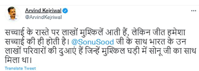 दिल्ली के मुख्यमंत्री सीएम केजरीवाल ने सोनू सूद का समर्थन किया। उन्होंने ट्वीट कर लिखा- सच्चाई के रास्ते पर लाखों मुश्किलें आती हैं, लेकिन जीत हमेशा सच्चाई की ही होती है। @SonuSood जी के साथ भारत के उन लाखों परिवारों की दुआएं हैं जिन्हें मुश्किल घड़ी में सोनू जी का साथ मिला था।