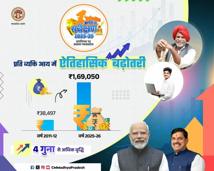 3. वित्तीय वर्ष 2011-12 से वित्तीय वर्ष 2025-26 की अवधि के दौरान मध्यप्रदेश की प्रति व्यक्ति शुद्ध आय प्रचलित मूल्यों पर ₹38,497 से बढ़कर ₹1,69,050 हो गई तथा स्थिर (2011-12) मूल्यों पर ₹38,497 से बढ़कर ₹76,971 हो गई, जो वास्तविक आय स्तर में उल्लेखनीय सुधार को दर्शाता है।