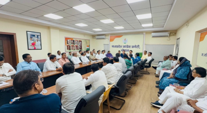 भोपालः इंदिरा भवन मध्यप्रदेश कांग्रेस कमेटी के तत्वावधान में प्रदेश के सभी जिला प्रभारियों की एक महत्वपूर्ण बैठक आयोजित की गई। बैठक की अध्यक्षता मध्य प्रदेश कांग्रेस के प्रभारी हरीश चौधरी एवं प्रदेश कांग्रेस अध्यक्ष जीतू पटवारी ने की।