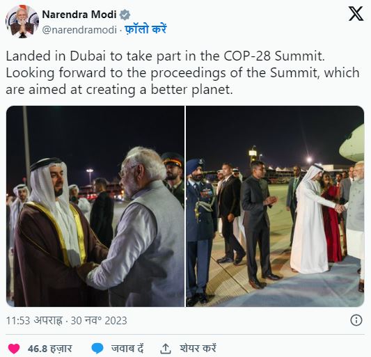 दरअसल यह कार्यक्रम 30 नवंबर से शुरु हुआ है और 12 दिसंबर तक चलेगा. वहीं दुबई पहुंचते ही पीएम ने सोशल मीडिया पर एक पोस्ट कर कहा कि सीओपी 28 शिखर सम्मेलन में भाग लेने के लिए दुबई पहुंच गया हुं और सम्मेलन की कार्यवाही को लेकर उत्सुक हुं. मोदी ने आगे कहा कि उन्हे यह देख कर खुशी हुई कि ये महत्वपूर्ण कार्यक्रम संयुक्त अरब अमीरात की अध्यक्षता में आयोजित किया जा रहा है. जो जलवायु कार्रवाई के क्षेत्र में भारत का एक महत्वपूर्ण साझेदार है.