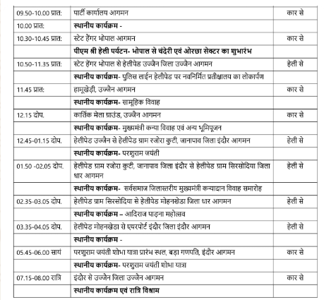 प्रातः 10.50-11.35 स्टेट हैंगर भोपाल से हेलीपैड़ उज्जैन आगमन- उज्जैन पुलिस लाइन हेलीपैड पर नव निर्मित प्रतीक्षालय का लोकार्पण।