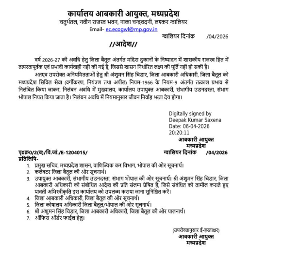 प्रदेश में करीब 400 शराब दुकानों की नीलामी अब तक पूरी नहीं हो सकी है, जिससे वर्ष 2026-27 के लिए आबकारी विभाग को तय राजस्व लक्ष्य हासिल करने में दिक्कत आ रही है। इस सूची में बैतूल के अलावा आशोकनगर और गुना जिला भी शामिल हैं। मामले को गंभीर मानते हुए आबकारी आयुक्त दीपक सक्सेना ने कार्रवाई की है और तीनों जिलों के जिला आबकारी अधिकारियों को निलंबित कर दिया है।