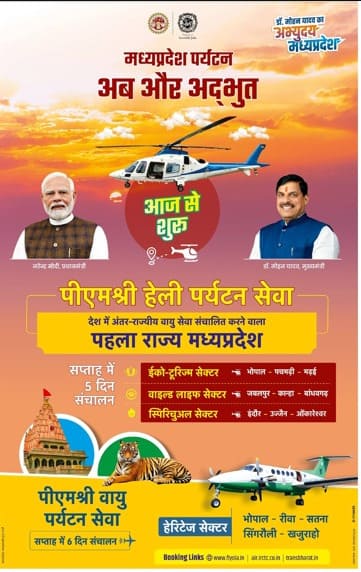 मध्यप्रदेश में पर्यटन क्षेत्र के लिए ऐतिहासिक दिन आ गया है। 20 नवंबर से पूरे प्रदेश में “पीएमश्री हेली पर्यटन सेवा” का नियमित संचालन शुरू हो गया है। इस सेवा के साथ मध्यप्रदेश देश का पहला राज्य बन गया है, जिसने अंतर्राज्यीय वायु पर्यटन सेवा की शुरुआत की है।