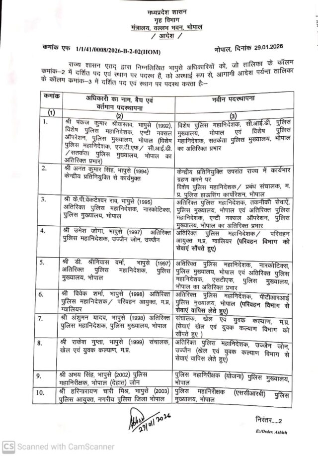 आदेश मध्यप्रदेश शासन गृह विभाग की ओर से जारी किए गए हैं। माना जा रहा है कि इस फेरबदल का उद्देश्य प्रशासनिक कार्यप्रणाली में तेजी लाना और विभिन्न क्षेत्रों में बेहतर समन्वय स्थापित करना है।