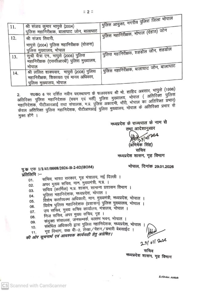 मध्यप्रदेश में पुलिस विभाग में बड़ा प्रशासनिक फेरबदल किया गया है। राज्य सरकार ने वरिष्ठ स्तर पर कई महत्वपूर्ण पदों पर बदलाव करते हुए 14 आईपीएस अधिकारियों के तबादले के आदेश जारी किए हैं। इस फेरबदल के तहत राजधानी सहित विभिन्न जोन और विभागों में नई जिम्मेदारियां सौंपी गई हैं।