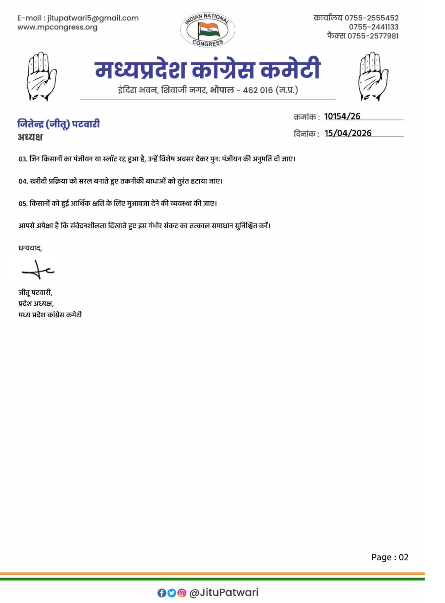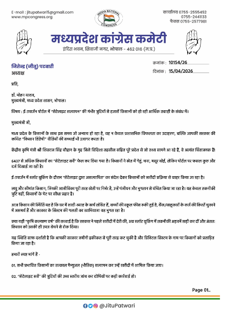 भोपालः मध्यप्रदेश कांग्रेस कमेटी के अध्यक्ष जीतू पटवारी ने मुख्यमंत्री को पत्र के माध्यम से प्रदेश के किसानों की गंभीर समस्या को उठाते हुए कहा कि वर्तमान में किसानों के साथ जो अन्याय हो रहा है, वह केवल प्रशासनिक विफलता नहीं, बल्कि सरकार की कथित “किसान हितैषी” नीतियों की सच्चाई को उजागर करता है।