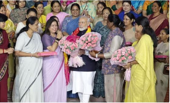 नई दिल्लीः संसद के दोनों सदनों में महिला आरक्षण बिल पास हो चुका है। राज्यसभा से 214 तो लोकसभा से 454 वोट महिला आरक्षण के पक्ष में पड़े, जिसके तहत ये विधेयक दोनों सदनों से पास हो गया है। महिला आरक्षण को लेकर राजधानी दिल्ली में काफी खुशी का माहौल है। दिल्ली स्थित बीजेपी कार्यालय में बीजेपी महिला सांसदों ने प्रधानमंत्री नरेंद्र मोदी का जोरदार स्वागत किया। पीएम मोदी दिल्ली स्थित बीजेपी कार्यलय पहुंचे तो वहां उपस्थित सभी महिलाओं ने उन पर फूल बरसा कर स्वागत किया।